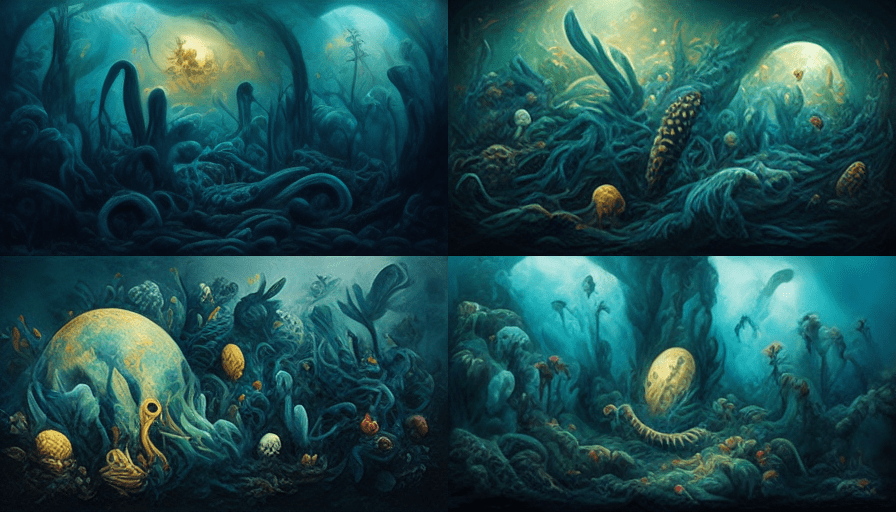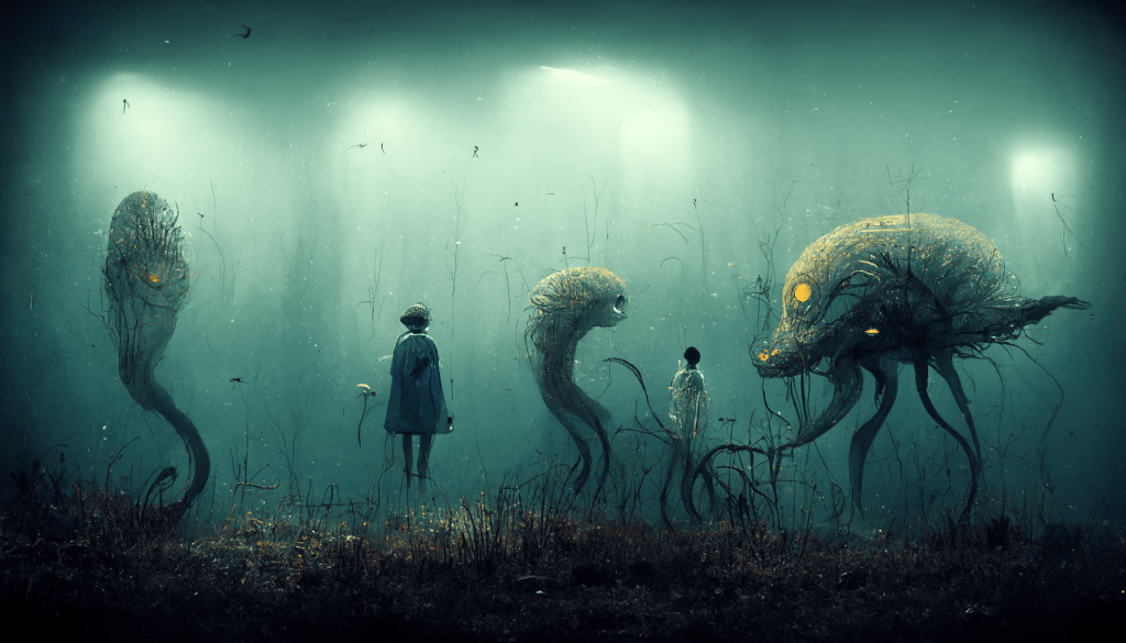 It depicts an unknown world encountering mysterious aquatic creatures.