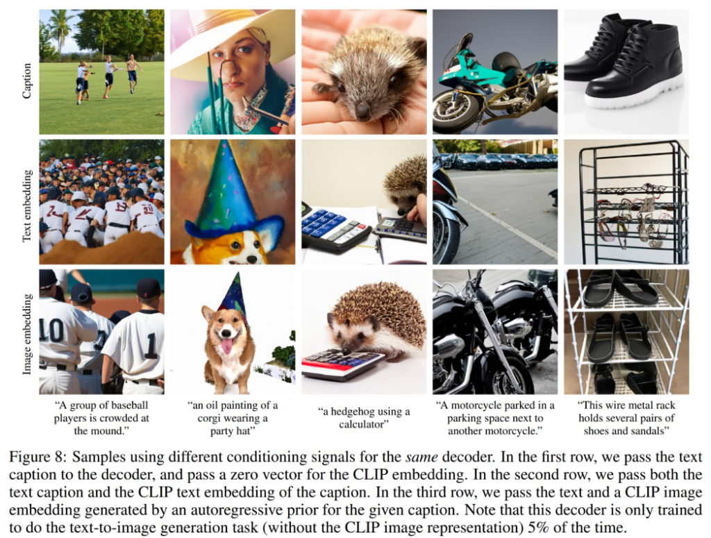 The diffusion decoder in DALL·E 2 is a modified GLIDE model with 3.5 billion parameters. CLIP image embeddings are projected and combined with the existing timestep embedding, and also projected into four extra tokens of context, which are then added to the output sequence from the GLIDE text encoder. The original GLIDE text conditioning pathway is retained, as it could potentially help the diffusion model learn aspects of natural language that CLIP might not capture, though it has limited impact. During training, CLIP embeddings are randomly set to zero 10% of the time, and the text caption is randomly dropped 50% of the time.