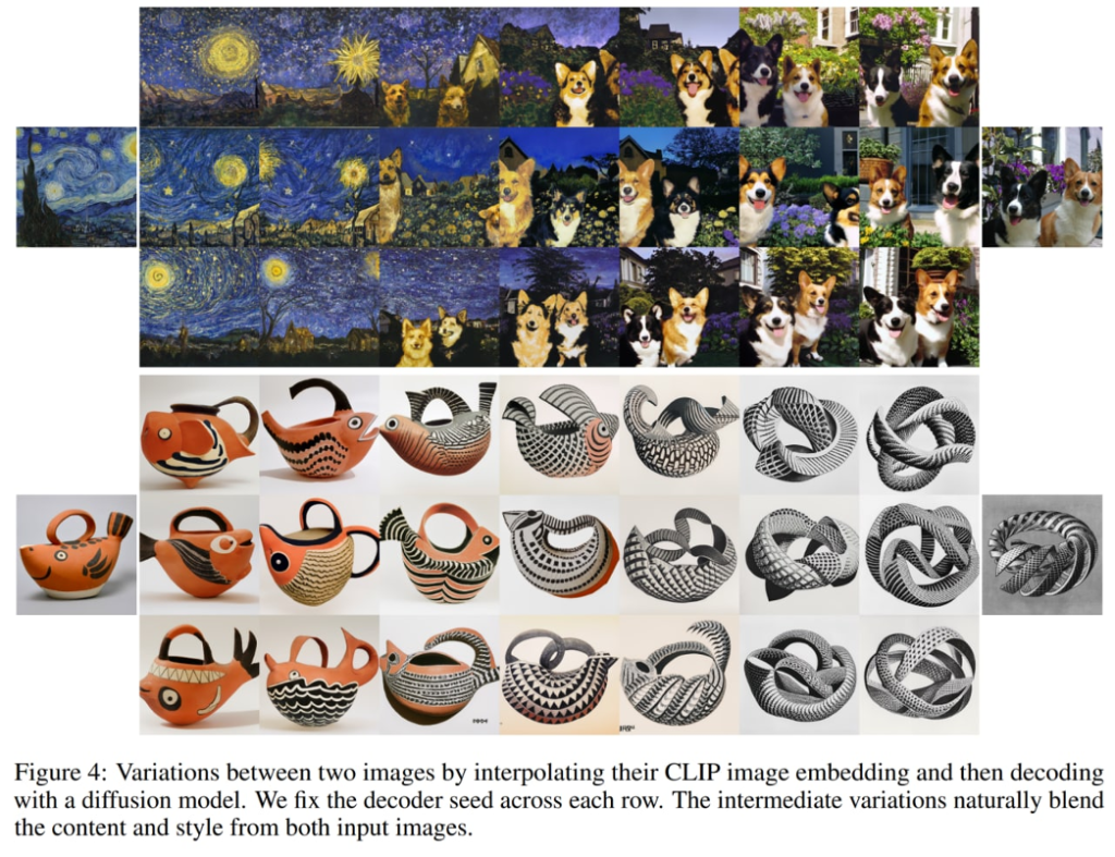 Interpolating between images x1 and x2: To do this, take the CLIP image embeddings zi1 and zi2, and apply slerp (Spherical Linear Interpolation) to obtain intermediate CLIP image representations. For the corresponding intermediate DDIM latent xTi, you have two options: