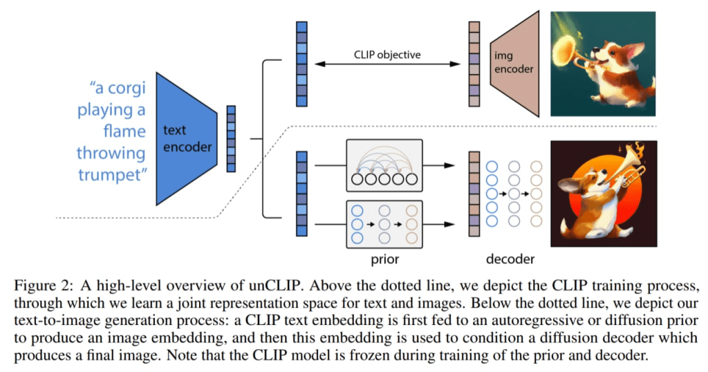 DALL·E 2 is a smart combination of the CLIP and GLIDE models, and its full text-conditional image generation architecture is internally referred to as unCLIP in the paper. This is because it generates images by inverting the CLIP image encoder.