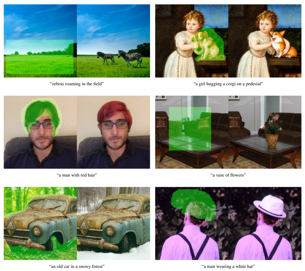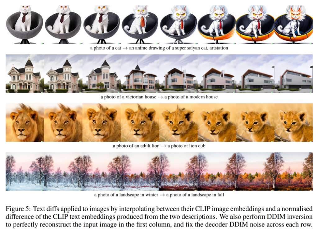 Language-guided image manipulations or text diffs: To modify an image to reflect a new text description y, first obtain its CLIP text embedding zt and the CLIP text embedding zt0 of a caption describing the current image (which could be a dummy caption like “a photo” or an empty caption). Then, compute a text diff vector zd = norm(zt − zt0). Next, rotate between the image CLIP embedding zi and the text diff vector zd using slerp and generate images with the fixed base DDIM noise xT throughout the entire trajectory.