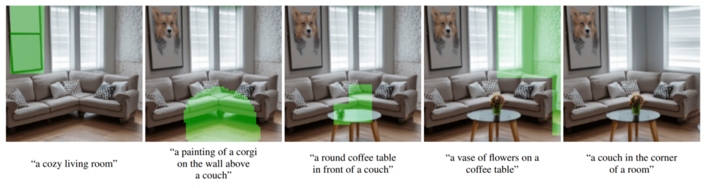 GLIDE can be used iteratively to create complex scenes by first generating an image using a zero-shot approach and then applying a series of inpainting edits. For example, an image could be generated with the prompt “a cozy living room.” Inpainting masks are then applied, along with follow-up text prompts, to add a painting to the wall, a coffee table, a vase of flowers on the coffee table, and finally to move the wall up to the couch. This iterative process allows GLIDE to produce detailed and customized images based on user input.
