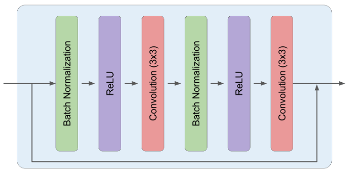 Each residual block is composed of two sub-blocks, and each of these sub-blocks is composed of a Batch Normalization, ReLU, and 3x3 Convolution in sequence.
