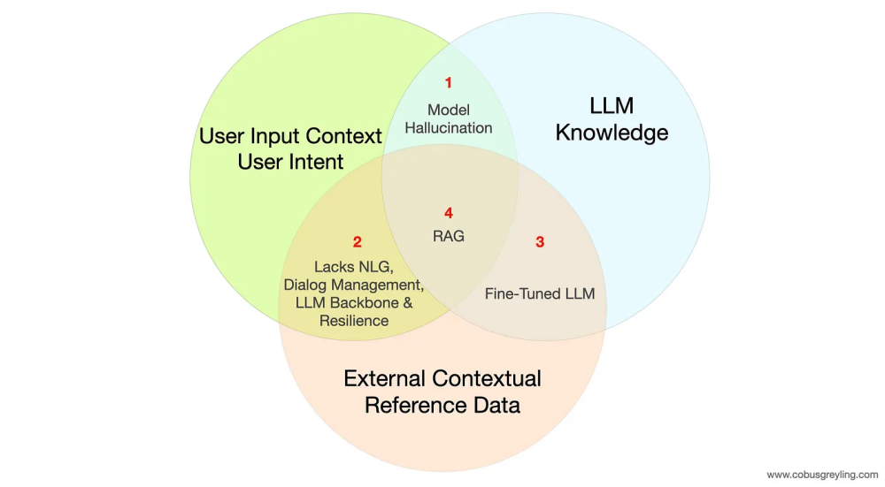 Retrieval Augmented Generation (RAG) is a framework that integrates Large Language Models (LLMs) with external data sources for more contextually accurate responses. Three core components—User Input Context, LLM Knowledge, and External Contextual Reference Data—are involved. RAG serves as an intersection of these elements, aimed at overcoming the limitations of LLMs such as hallucination and the lack of real-time contextual data.