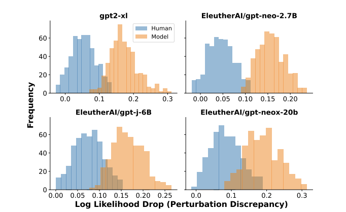 Small perturbations to machine-generated passage should result in relatively large average differences in log probability compared to human-written text