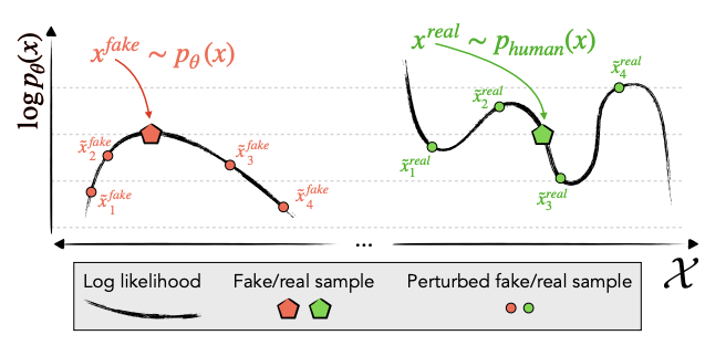 DetectGPT hypothesis: machine-generated samples lie in areas of negative curvature of log probability function, unlike human text
