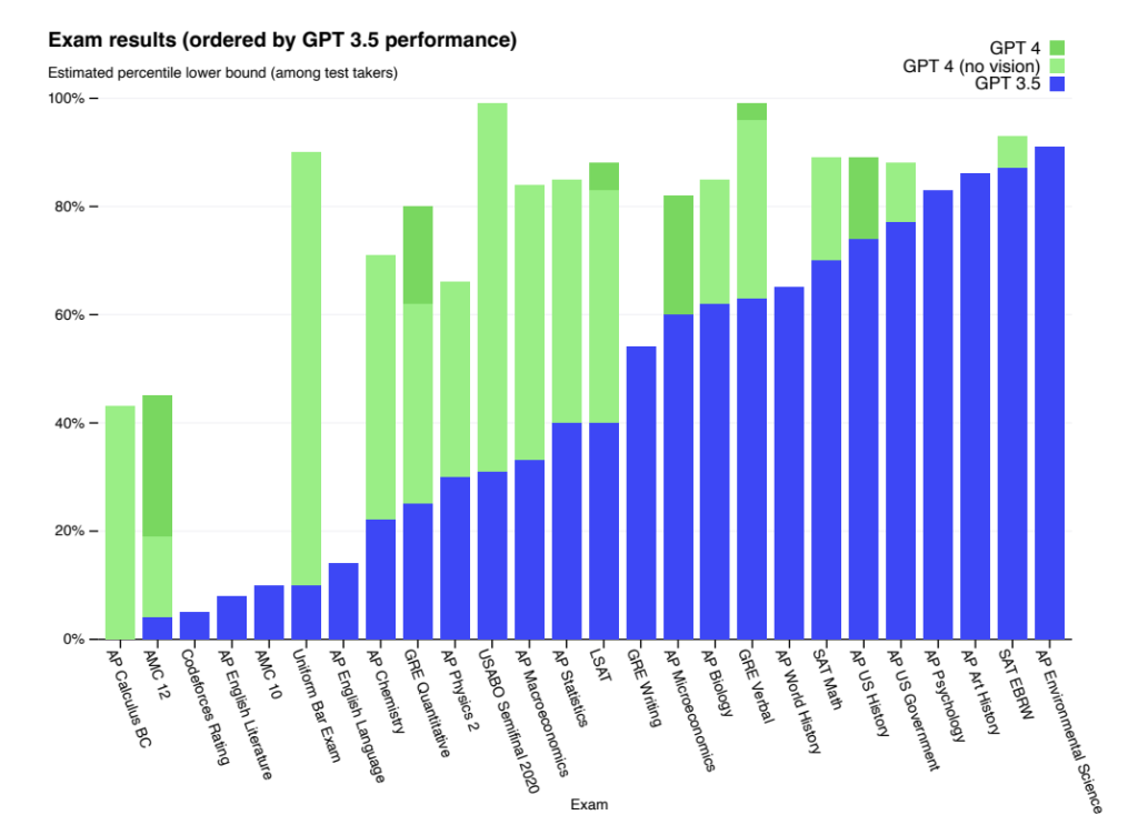GPT-4 demonstrates superior reasoning abilities compared to ChatGPT, scoring higher on tests like the Uniform Bar Exam and Biology Olympiad.