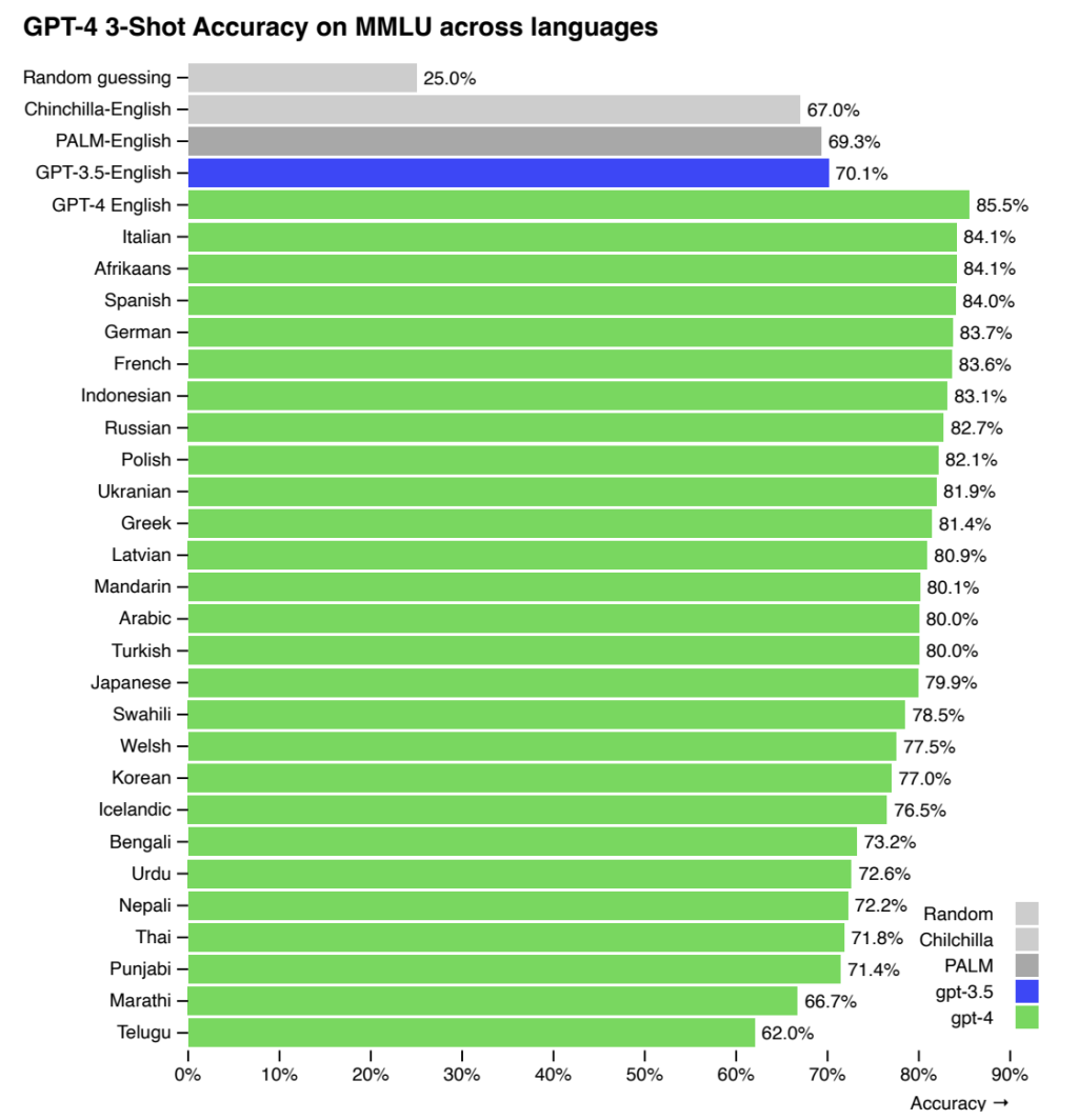 Fig. 137 Performance of GPT-4 in a variety of languages compared to prior models in English on MMLU.#
