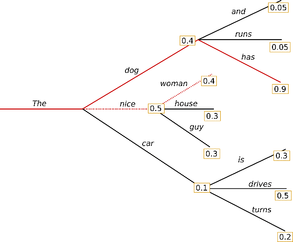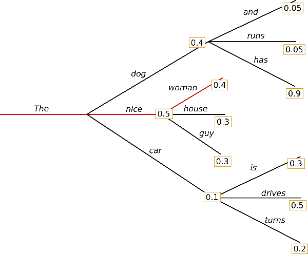 For example, starting with the word “The”, the algorithm evaluates the probabilities of all possible next words and greedily selects the one with the highest probability, such as “nice”. The process is repeated to generate the subsequent words in the sequence. In this case, the final generated word sequence is (“The”, “nice”, “woman”). The overall probability of this sequence is calculated by multiplying the probabilities of each chosen word, which is \(0.5 \times 0.4 = 0.2\) in this example.