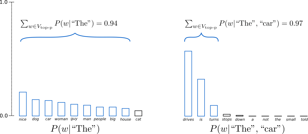 To address these concerns, Ari Holtzman et al. (2019) introduced Top-p or nucleus sampling, which dynamically selects the \(K\) value based on a threshold probability \(p\), leading to a more adaptive approach.