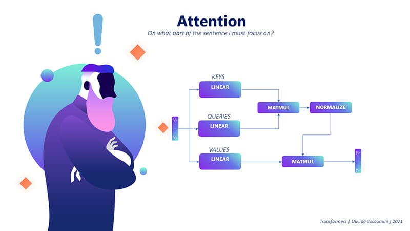 By following these steps, the attention mechanism can selectively focus on different parts of the input sentence to provide the necessary context for understanding and processing the information. This powerful mechanism is at the core of the Transformer architecture and plays a crucial role in its success in various natural language processing tasks.