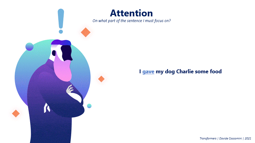 Finally, to determine the object of the action, we could ask, “What did I give to the dog?” Here, the attention mechanism would focus on the word “food”, as it represents the object being given.