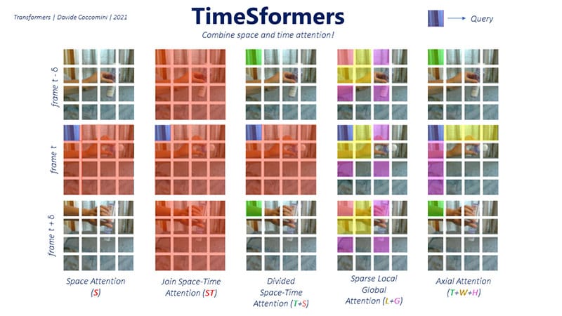 At the beginning of 2021, Facebook researchers took the concept of Transformers even further by introducing TimeSformer, a new variation of the Transformer model specifically designed for video understanding. They published a paper titled “Is space-time attention all you need for video understanding?” [Bertasius et al., 2021]. TimeSformer leverages the attention mechanism to process not only spatial information in video frames but also temporal information across multiple frames. This approach allows the model to recognize and analyze patterns in both space and time, making it well-suited for tasks such as action recognition and video classification.