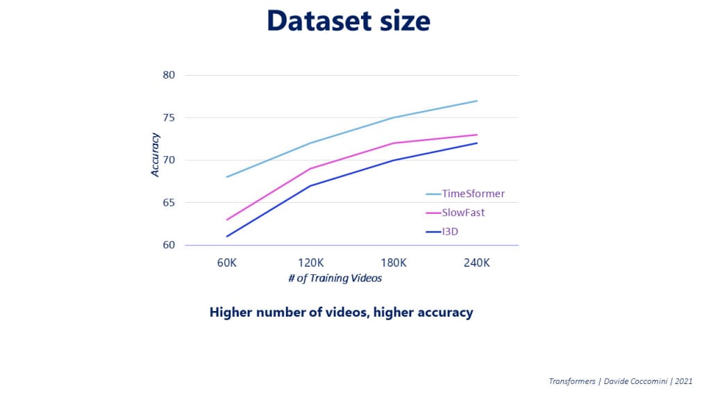 Similar to Vision Transformers, the authors of TimeSformers explored the impact of using larger training datasets on the model’s accuracy. They found that as the number of training videos considered increases, the accuracy of the model also improves. This suggests that TimeSformers, like Vision Transformers, can benefit from larger datasets for better performance.