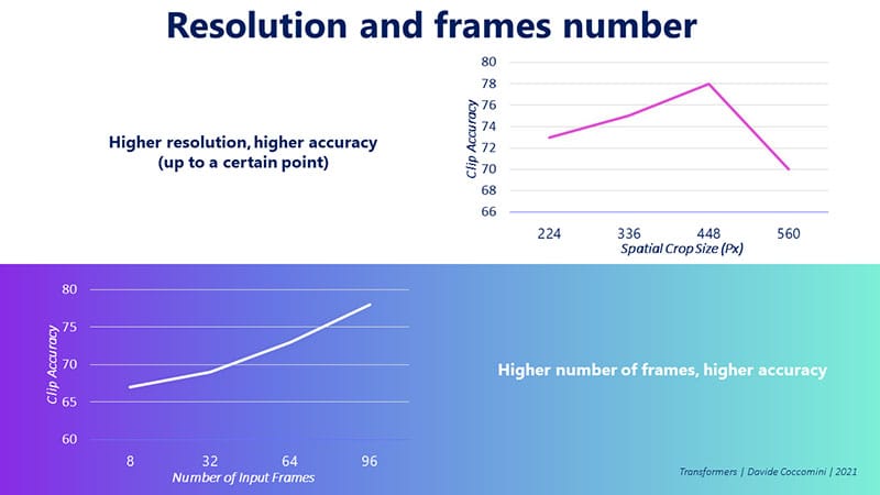 The authors discovered that increasing the resolution of the video leads to better model accuracy, up to a certain point. Similarly, they found that as the number of frames in a video increases, the model’s accuracy also improves. However, they were unable to conduct tests with a higher number of frames than what is shown in the graph, so it remains unclear whether the accuracy could continue to improve with even more frames. The upper limit of this potential improvement is still unknown.