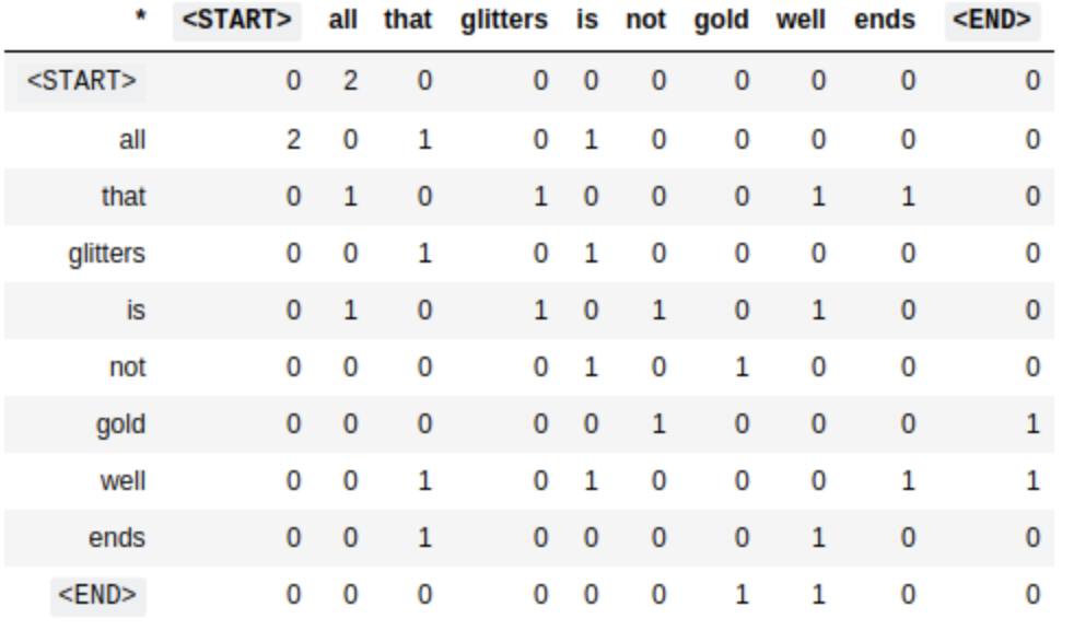 Then, with a window size of 1, the co-occurrence matrix of the words in the corpus is: