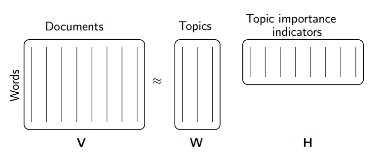 In contrast to constraining our factors to be orthogonal as in SVD, we can constrain them to be non-negative. NMF is a factorization of a non-negative data set \(V\) into non-negative matrices \(W\) and \(H\): \(V=WH\). Often, positive factors are more easily interpretable, contributing to NMF’s popularity.