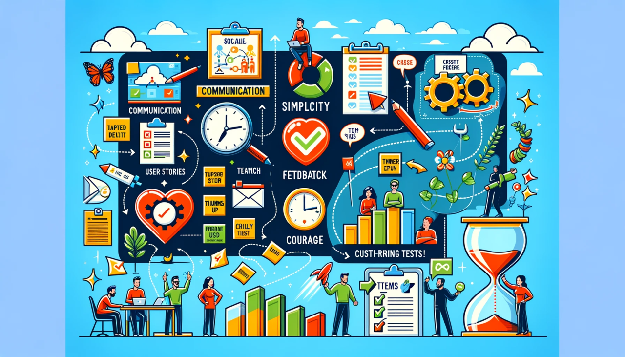 Emphasis on communication, simplicity, feedback, and courage in techniques.